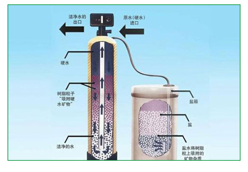 原水在一定的压力(0.2-0.6Mpa)、流量下,通过控制器阀腔,进入装有离子交换树脂的容器(树脂罐),树脂中所含的Na+与水中的阳离子(Ca2+,Mg2+,Fe2+……等)进行交换,使容器出水的Ca2+,Mg2+离子含量达到既定的要求,实现了硬水的软化。
